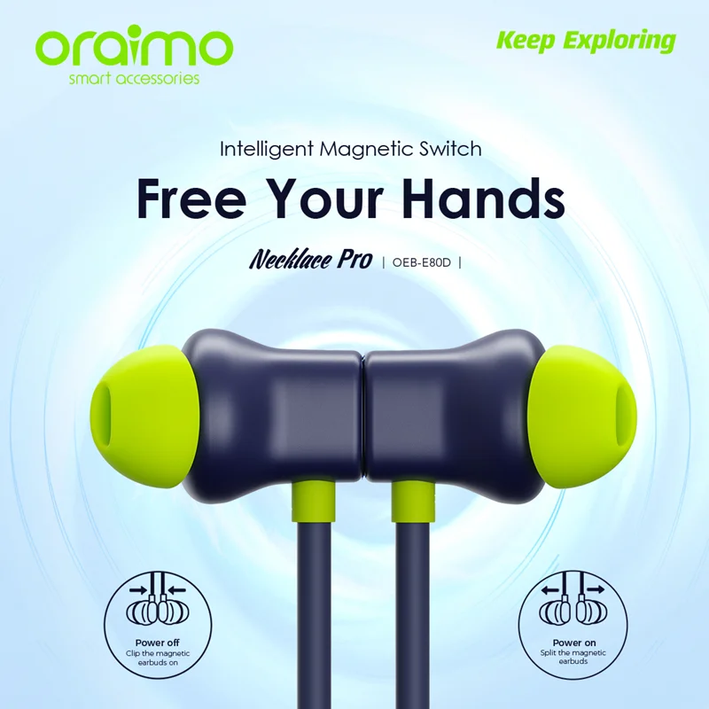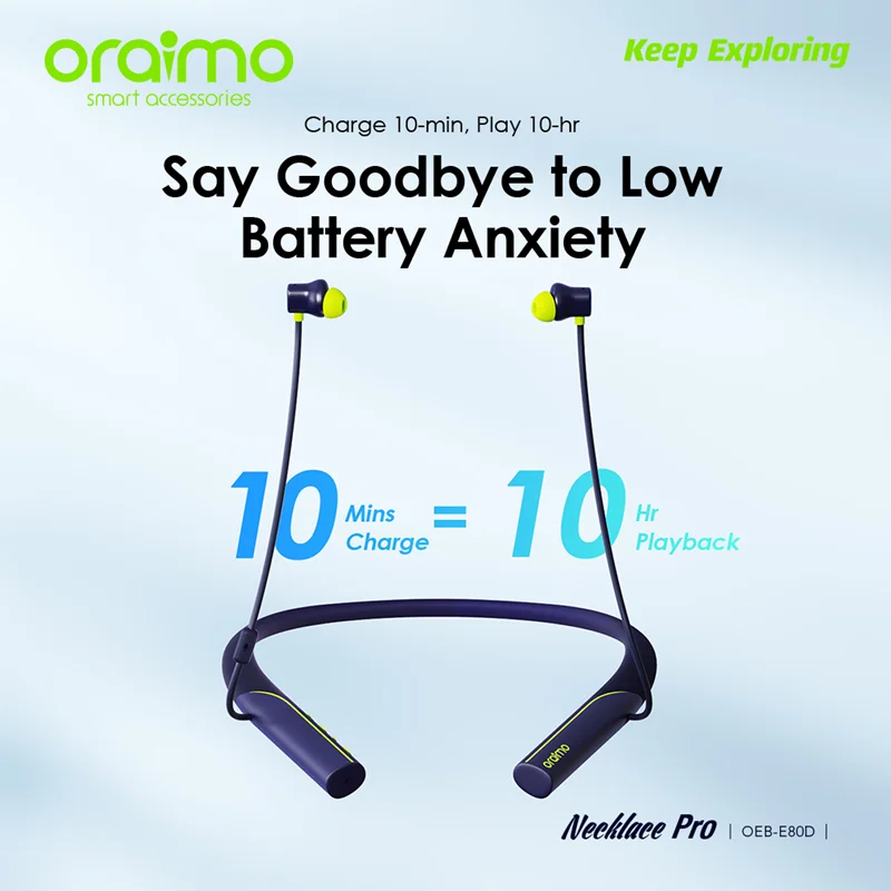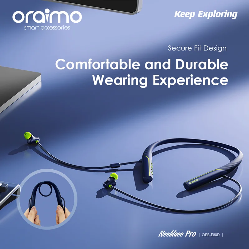 شما نیز شاهد یک طراحی بی نظیر از هندزفری بلوتوثی گردنی اورایمو Necklace Pro Anc هستید. بدن اصلی دور گردن شما قرار می گیرد و شاخه های هندزفری گردنی اورایمو با کمک سیم به بدنه متصل هستند. بنابراین به هیچ وجه آن ها را گم نمی کنید و یا از گوش شما نمی افتند. یکی از مشخصات جالب این هندزفری بلوتوثی، وجود آهنربا در هر شاخه هندزفری می باشد. به این ترتیب در زمان هایی که قصد استفاده از آن ها را ندارید، می توانید هندزفری ها را به یکدیگر متصل کنید که در این صورت هندزفری به صورت هوشمند خاموش می شود. اما در صورت نیاز آن ها را از یکدیگر جدا کنید تا روشن شوند و اتصال لازم برقرار گردد. این ویژگی کمک می کند تا در صورت عدم نیاز به هندزفری، آن ها به یکدیگر گره نخورند و در مصرف باتری صرفه جویی هوشمندی انجام شود.عمر باتری این هندزفری را 50 ساعت اعلام نمودند و از دوام فوق العاده بالایی نیز برخوردار است. یک باتری لیتیومی 350 میلی آمپری دارد که می تواند با یک بار شارژ کامل به راحتی 50 ساعت دوام آورد. بنابراین باتری از عمر طولانی بهره مند است و می توانید بهترین استفاده را از آن داشته باشید. در صورتی که قابلیت حذف نویز را در هندزفری خود خاموش کنید، مدت زمانی 50 ساعته دارید و اگر آن را روشن کنید نیز این زمان به 32 ساعت کاهش پیدا خواهد کرد. در عین حال باید بدانید که با 10 دقیقه شارژ نمودن هندزفری گردنی Oraimo، امکان استفاده 10 ساعته از آن را خواهید داشت. پس در زمان شارژ صرفه جویی کنید و موسیقی را با لذت هرچه تمام تجربه نمایید.تجربه بازی های آنلاین با تاخیر کم در صدا و تصویر برای افرادی که گیمر حرفه ای محسوب می شوند، اهمیت بالایی دارد. شما می توانید حین بازی و یا تماشای ویدئو، بهترین لحظات را برای خود ایجاد کنید. همگام سازی صوتی و تصویری در هندزفری اورایمو e80d فوق العاده به نظر می رسد و می تواند جذابیت بالایی داشته باشد.از آن جایی که هندزفری اورایمو e80d از استاندارد IPX5 پشتیبانی می کند و پوشش نانو دارد، می توانید هنگام بارندگی و یا تمرینات سخت ورزشی هم همچنان از آن استفاده ای داشته باشید. این محصول در برابر تعریق بدن و پاشش آب کاملا مقاوم است و می تواند نیاز شما را در این شرایط سخت برآورده سازد.