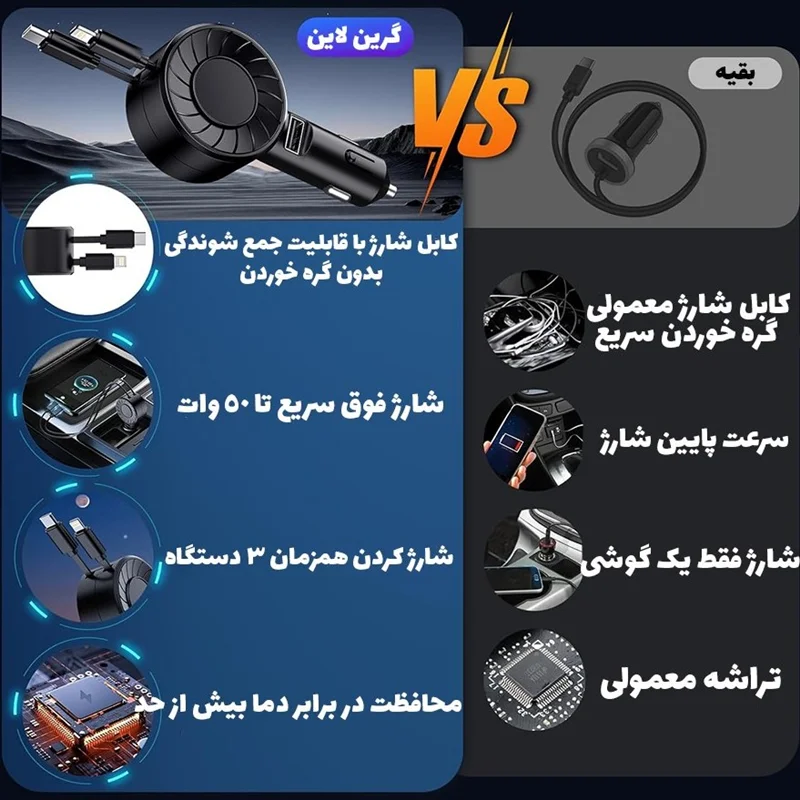 با شارژر فندکی 50 وات گرین لاین مدل Telescopic 50W، سرعت را به شارژ دستگاههایتان هدیه دهید! این محصول با دو کابل همراه تلسکوپی، شما را از حمل کابلهای اضافی بینیاز میکند. طراحی هوشمند، ایمنی بالا و قابلیت شارژ همزمان چند دستگاه، این شارژر را به انتخابی ایدهآل برای هر خودرویی تبدیل کرده است. همین حالا تجربهی جدیدی از شارژ سریع و مطمئن را داشته باشید!