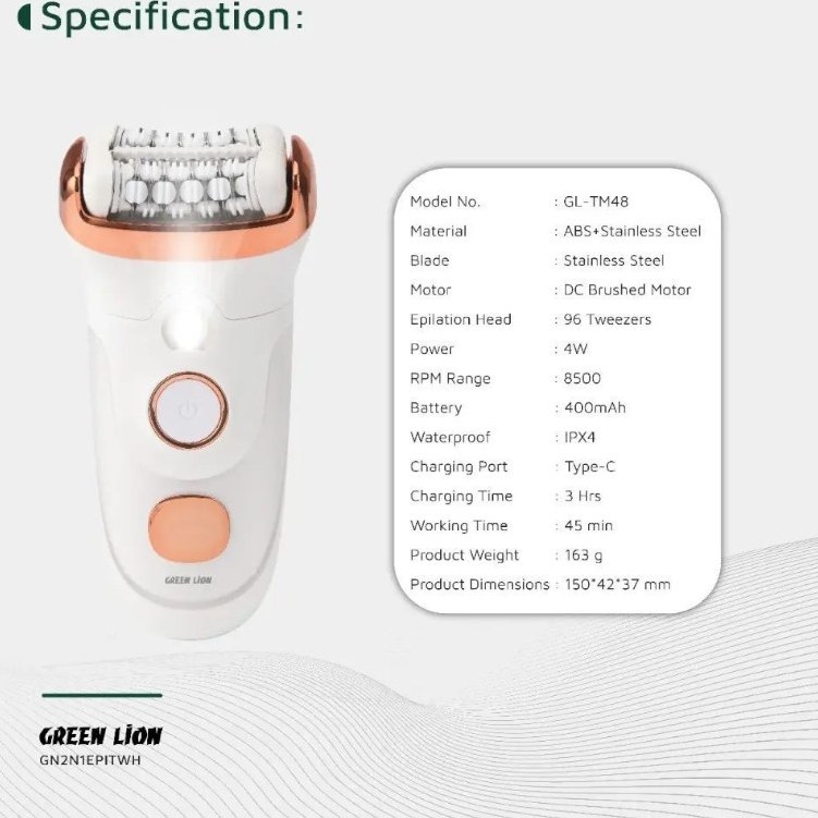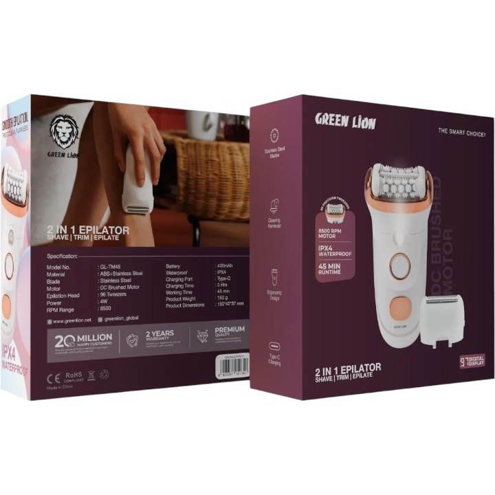 اپیلاتور ۲ در ۱ اصلاح، اپیلاسیون گرین لاین Green Lion 2 in 1 Epilator، یک دستگاه چندمنظوره برای اصلاح، اپیلاسیون و مراقبت از پوست است. این دستگاه با طراحی ارگونومیک و موتور قدرتمند DC Brushed با سرعت 8500 دور در دقیقه عملکردی دقیق و سریع ارائه میدهد. سری اپیلاتور با ۹۶ موچین استیل ضد زنگ، موها را از ریشه خارج کرده و پوستی نرم و لطیف به شما میبخشد. همچنین با قابلیت ضد آب IPX4، میتوانید از آن در محیطهای مرطوب مانند حمام استفاده کنید. این اپیلاتور با پورت شارژ Type-C و باتری قوی، تا ۴۵ دقیقه کارکرد مداوم را فراهم میکند. ترکیب طراحی زیبا، عملکرد کارآمد و کیفیت ساخت بالا باعث شده تا این محصول به یکی از بهترین انتخابها برای اصلاح خانگی تبدیل شود.